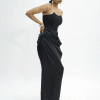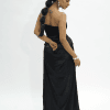 - Structure:- A sculpted structure with bust-enhancing boning, a refined neckline, and a pleated waist that elegantly flows into a dramatic floor-length hem.