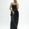 - Structure:- A sculpted structure with bust-enhancing boning, a refined neckline, and a pleated waist that elegantly flows into a dramatic floor-length hem.