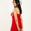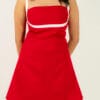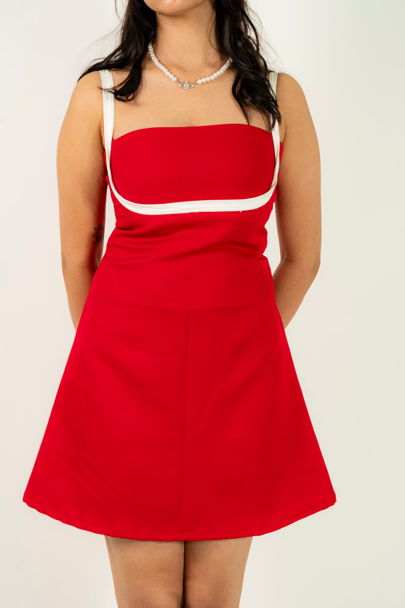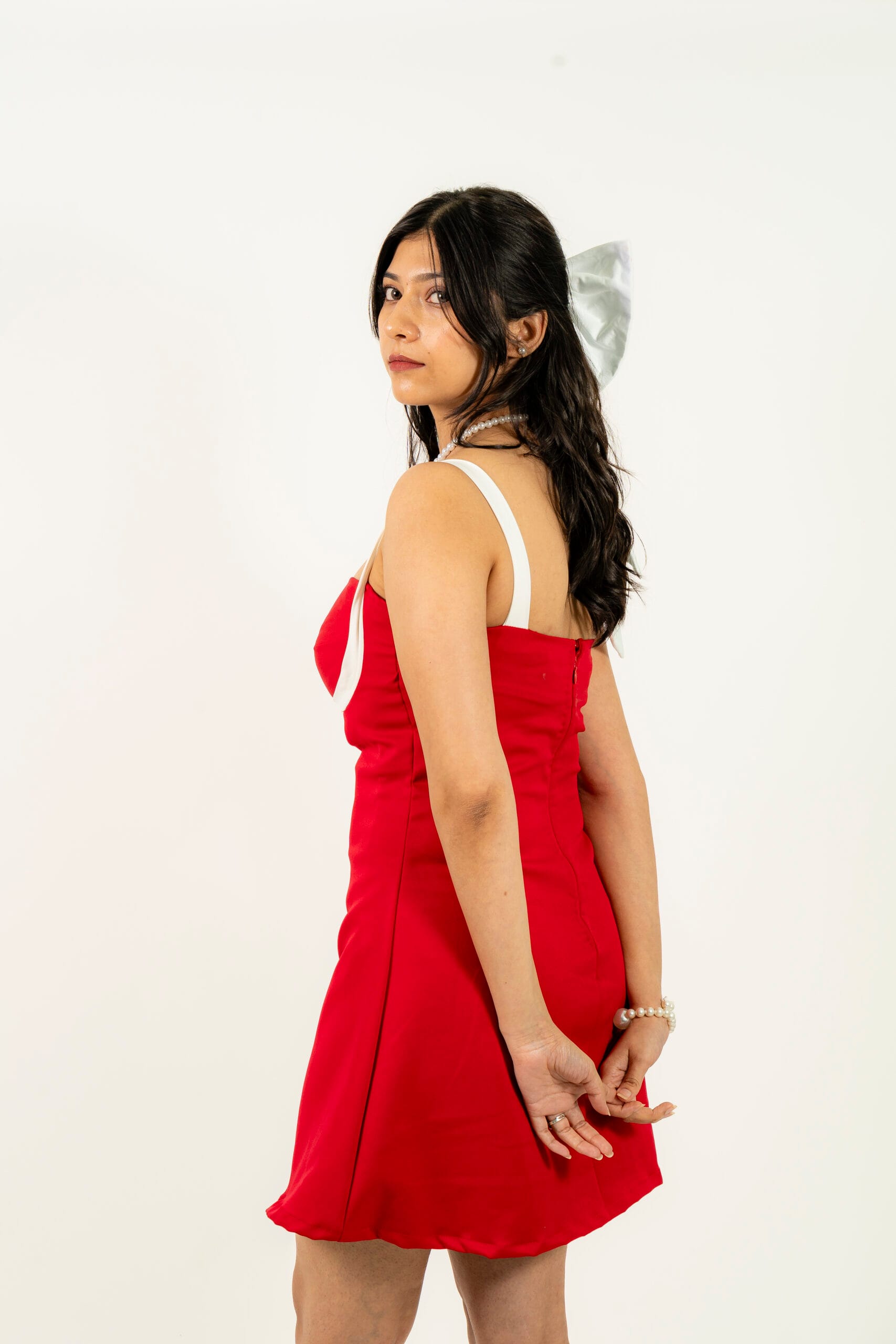 Crimson Dress Turn heads with this striking Crimson Dress, crafted in smooth banana crepe for a flattering drape. The bold crimson hue is beautifully contrasted by a sleek white strap tracing the bustline, adding definition and a modern edge. Designed in a mini length for a playful yet polished look, it features a statement chain closure at the back, blending function with a hint of glam. Perfect for day-to-night styling with effortless flair.