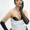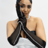 The Linear Pearl Gloves in black soft net feature an elegant elbow-length design adorned with a sophisticated side pearl embellishment. These gloves seamlessly blend classic luxury with modern chic, offering a refined touch to any outfit with their unique pearled detail and graceful silhouette.