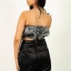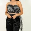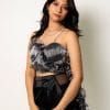 Metallic Ruffle BustierUnveil a stunning blend of drama and sophistication with the Metallic Space Grey Ruffle Bustier. This eye-catching piece is crafted from luxurious tissue fabric, featuring a cascading ruffle trail that flows gracefully from the neckline to the side mid length, creating a striking visual impact. The gathering design wraps elegantly from front to back, adding depth and texture. The back is finished with a bold lace-up closure through eyelids, offering an adjustable fit and a touch of edgy flair. The metallic space grey hue enhances its contemporary allure, making it a standout piece for any fashion-forward wardrobe. You can pair it with our black Satin folded-up pants and stylish heels for a standout ensemble that blends edgy glamour with sophisticated refinement.
