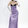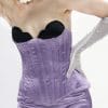Featuring a bold black accent at the bust that beautifully contrasts its soft lilac satin body. Designed with multiple boning inserts for a flawless hourglass shape, it offers a structured fit that enhances your natural curves. The back is detailed with metal eyelets and adjustable lacing, ensuring the perfect, cinched silhouette. The unique mix of delicate lilac and striking black makes this corset a show-stopping piece, combining luxurious texture with an edgy, modern twist.